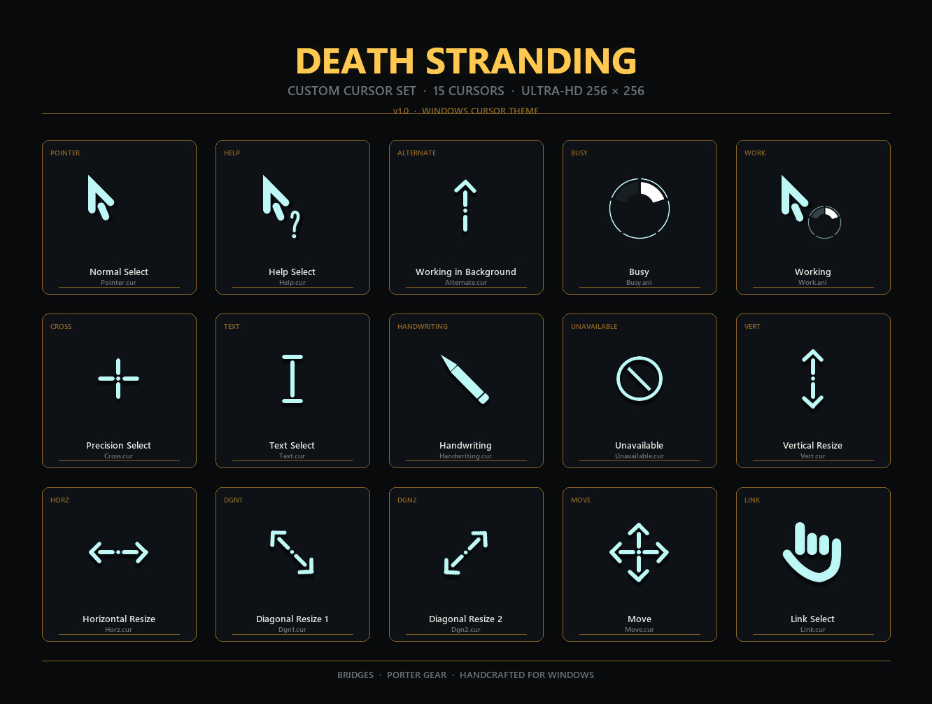 受《死亡搁浅》视觉风格启发的 Windows 自定义光标主题,15 种光标状态,Ultra-HD 256×256 分辨率,包含 Python 展示图生成器。 A Windows custom cursor theme inspired by Death Stranding's visual style. 15 cursor states, Ultra-HD 256×256 resolution, with a Python showcase generator.